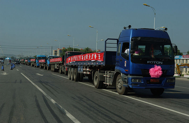 長龍車隊(duì)所到之處,立即引起巨大轟動(dòng)。奔馳、寶馬等貴族車隊(duì)和一輛輛樸實(shí)而又厚重的大掛車相比,頓時(shí)黯然失色——途中遇到的10余個(gè)結(jié)婚車隊(duì),都紛紛讓路。